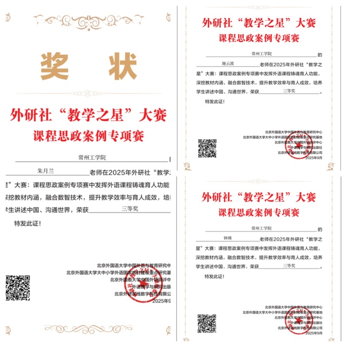 近日,2025年外研社“教学之星”大赛课程思政案例专项赛评选结果正式公布。外国语学院朱月兰、钟瑛、施云波三位教师凭借其精心设计与实施的课程思政案例,在全国众多参赛作品中脱颖而出,荣获全国三等奖。