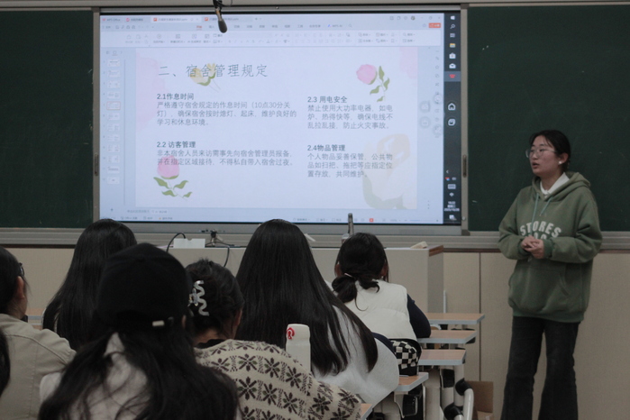会上,学生会生活部部长朱红同学结合自身学生工作经历,生动阐释了寝室长作为基层学生公寓管理基石的不可替代性。她立足近期学生社区宿舍检查结果,从角色认知、管理规范、卫生标准等七个维度展开系统讲解,通过案例分析帮助寝室长明确工作重点。王彤老师聚焦宿舍安全主题,详细解读公寓管理规定,以真实案例警示违规电器使用风险,强调安全防线须常抓不懈。他同时围绕内务卫生、纪律要求、奖惩机制等日常事务开展实务培训,并就本学期“示范寝室”创建评比、科学作息打卡等活动进行动员部署。