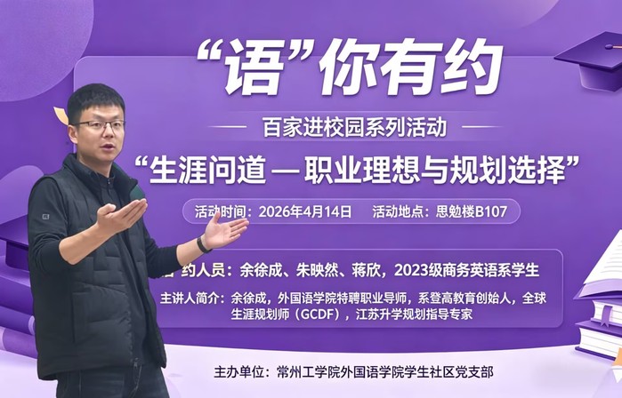 为进一步帮助同学们明确职业方向,强化就业指导,近日,外国语学院特邀全球生涯规划师、学院特聘职业导师余徐成老师,为外院学子作以“职业理想与规划选择”为主题的就业指导专题分享。